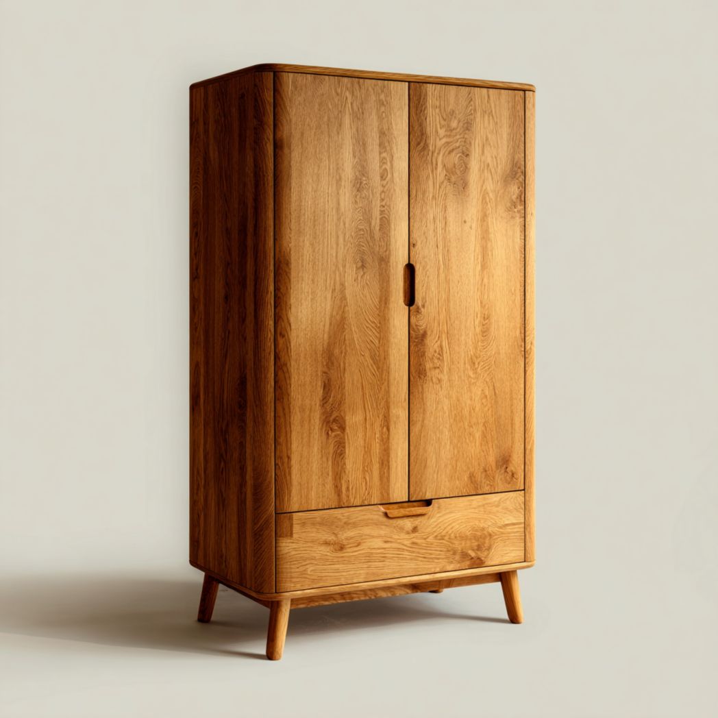 Armoire deux portes en bois de chêne massif avec tiroir inférieur et pieds hauts